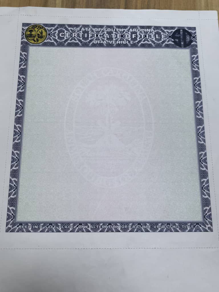South Carolina Car Title Certificate quantity